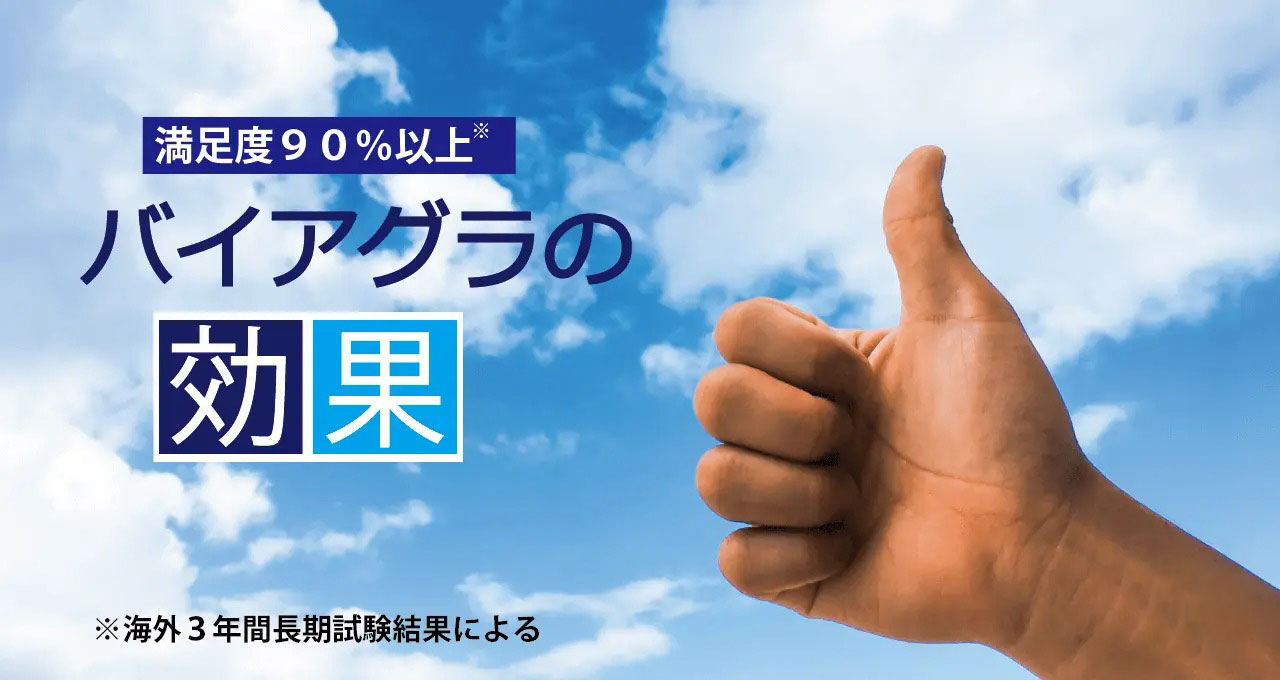 バイアグラの効果は、服用後約1時間で現れ、「勃起補助効果」が4~5時間程度持続します。性的興奮があるときのみに作用し、日本人では、81%の方にED改善効果があったと報告されています。また米国の3年間の試験では、91.7%の方が「バイアグラの効果に満足している」と回答されています。
