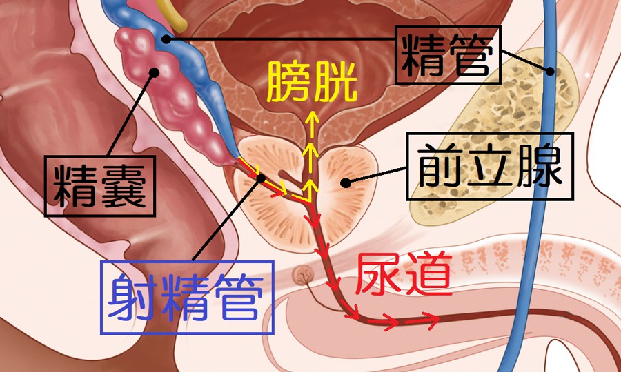 通常は以下の図の赤い矢印の経路で精液が通り射精しますが、逆流性射精の場合は黄色い矢印の膀胱側に精液が流れてしまうためオーガズムに達し射精感はあっても放出される精液の量が少なくなったり、無射精(精液が出ない)といったことが起こるのです。