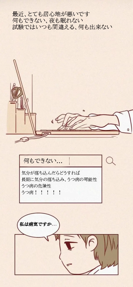 日本におけるうつ病の生涯有病率(調査時までに病気にかかったことのある人の割合)は6.7%で、およそ15人に1人がうつ病を経験している計算になりますから、けっして珍しい病気ではなく、だれでもかかる可能性があります。今日は漫画で患者が何を経験しているかを理解しましょ。