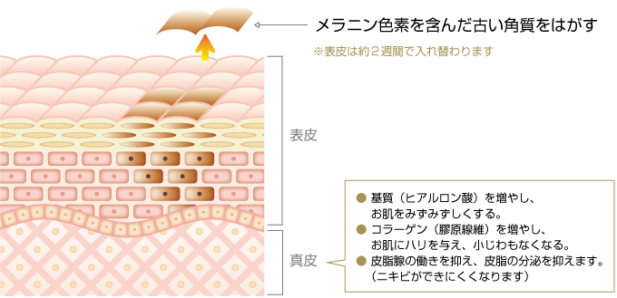 通常30日かかるターンオーバーを2週間に短縮し、表皮を生まれ変わらせると言われています。