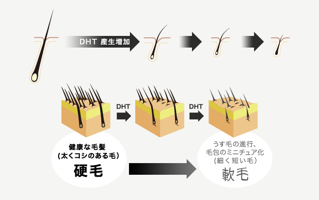 AGA(エージーエー)の脱毛部にはDHT(ジヒドロテストステロン)が高濃度にみられ、これがヘアサイクルの成長期を短くする原因物質と考えられています。成長期が短くなることにより、髪の毛が長く太く成長する前に抜けてしまいます。十分に育たない、細く短い髪の毛が多くなると全体としてうす毛が目立つようになります。