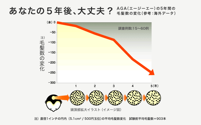 AGA(エージーエー)の人は全国で1,260万人*、そのうち気にかけている人は800万人、何らかのケアを行ったことのある人は650万人といわれています。AGA(エージーエー)は進行性です。何もせずにほうっておくと下記のグラフのように髪の毛の数は減り続け、徐々に薄くなっていきます。そのためAGA(エージーエー)は早めのケアが大切です。